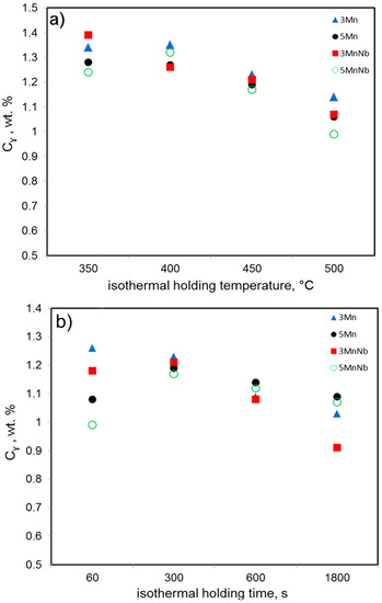 Based on the data listed in Figure 3 and Figure 4, it can be concluded that the maximum carbon content in RA was not detected at 400 °C, when the amount of the γ phase was the highest. The maximum carbon content in RA was detected in 350 °C; however, a fraction of this phase was not the highest. Hence, it seems that the optimal parameter which characterizes the thermodynamic stability of retained austenite is not the volume fraction or carbon content in the austenite, but the fγ0 × Cγ product. It is interesting that the values of the fγ0 × Cγ product were higher for the steels containing 3% Mn and the optimal time and temperature of isothermal holding were 400 °C (Figure 5a) and 300 s (Figure 5b), respectively. The values of the fγ0 × Cγ product are similar for the steels with or without Nb microaddition.