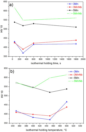 The hardness of the steel samples was measured using the Vickers method. The obtained results are presented in Figure 6 as a function of time and temperature. The data presented in Figure 6a show that the lowest hardness values were obtained for specimens isothermally held within 300 s, both for 3Mn and 5Mn type steels. However, it is worth to note that higher hardness values were detected for the steels containing 5% Mn, especially for the steels containing the Nb microaddition. This can suggest the higher degree of the transformation into martensite. Figure 6b shows the effect of the temperature of isothermal holding during bainitic transformation on the hardness changes. In the case of 3Mn, 3MnNb, and 5Mn type steels, the lowest hardness was obtained at 450 °C, whereas for the 5MnNb steel at 400 °C. Higher hardness values were detected for the steels with 5% Mn.