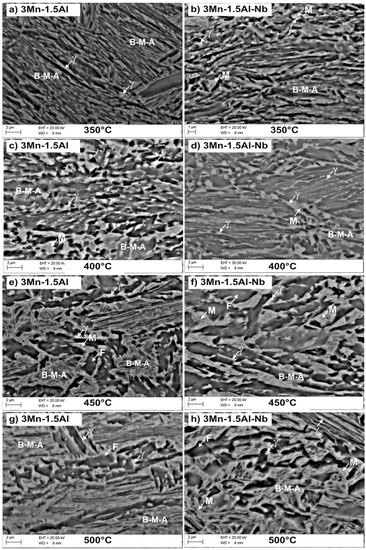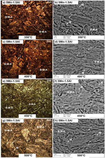 The more detailed information on the microstructure was revealed using the scanning electron microscope (SEM). Figure 8 shows the microstructures obtained for the specimens isothermally held between 350 and 500 °C. At 350 °C, the bainitic–martensitic laths were clearly observed and the retained austenite formed thin layers between the bainitic ferrite laths (Figure 8a,b). Increasing the bainitic transformation temperature up to 400 °C caused changes in the morphology of retained austenite. The fine-grained blocky retained austenite was observed at the boundary of bainitic–martensitic blocks (Figure 8c,d). Larger grains were subjected to partial martensitic transformation during cooling. As a consequence, they formed martensitic–austenitic regions (M–A). The confirmation of the phases using the EBSD (Electron Back-Scattered Diffraction) method can be found in our previous paper [5].