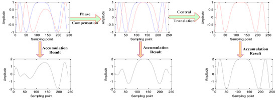 where is the amplitude of the pulse compression result. In order to realize the coherent accumulation of the calibration satellite echo in the time domain, both the initial phase and zero frequency positions of the baseband echo signal in each period should be the same. The initial phase and zero frequency positions can be obtained through pulse compression. Comparing Equation (9) with Equation (10), the zero frequency position is equal to the peak position of the pulse compression result , and the initial phase is equal to the corresponding phase [18]. The phase compensation factors are calculated in accordance with the difference of initial phase compared with the first period , and original echoes of each period are compensated respectively. The central translation of echoes is achieved by circularly shifting according to the difference of peak position compared with the first period . Then, the coherent accumulation of echoes can be achieved by accumulating the adjusted echoes in the time domain. The process of coherent accumulation and the waveforms of accumulated signal at different stages are shown in Figure 3.