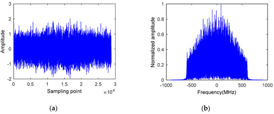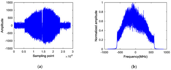 Real calibration satellite echoes are used to estimate the channel characteristics. We used 1000 periods of real calibration satellite echoes to improve the SNR in coherent accumulation process. Figure 5 is the waveform and spectrum of a real calibration satellite echo signal in one period. The signal was submerged in noise, since the RCS of LCS4 is only 0.947 m2 and the transmitting and receiving distance was around 1800 km. Figure 6 shows the waveform and spectrum of the signal, which was coherently accumulated by 1000 consecutive periods of real calibration satellite echoes in the time domain. The signal and noise can be distinguished in Figure 6a. As described in Section 3, the SNR in was improved to 12 dB and more accurate information of channel characteristic can be obtained via coherently accumulating in the time domain. Moreover, it can be seen that the waveform and spectrum of echoes are not ideal LFM signals, due to the modulation of the non-ideal channel characteristics.