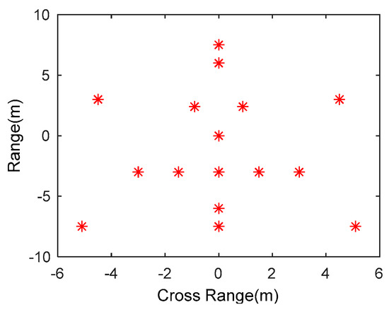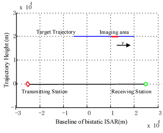 The simulation scenario is shown in Figure 7, in which the red “◊” is the location of the transmitting station, the green “○” is the location of the receiving station, the length of the radar baseline is 50 km, the blue line is the target trajectory, the target velocity is 400 m/s, and the red part is selected as the imaging area. The simulation scatter-point model is shown in Figure 8.
