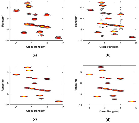 The simulated non-ideal echoes of the scatter-point target in Figure 6 was generated by multiplying the spectrum of the target’s ideal LFM echo signal with the channel transfer function estimated by real satellite echo data in a specific CPI. The channel transfer function for calibration is estimated by real satellite echo data in another adjacent CPI. The ISAR two-dimensional image without channel calibration is shown in Figure 9a. The two-dimensional ISAR image with channel calibration based on the single period echo and echoes of 1000 consecutive periods are shown in Figure 9b,c respectively. For comparison, Figure 9d shows the image of the target without adding non-ideal channel characteristics. As shown in Figure 9a, the image is defocused and the scatter points are split and broadened, due to the channels non-ideal characteristics and no channel calibration. Because of the low SNR using a single period echo, in Figure 9b the calibration coefficient cannot fully reflect the channel characteristics. Even if the channel calibration is conducted, the image quality cannot be improved effectively. On the contrary, the image is deteriorated due to the influence of noise. In Figure 9c, we coherently accumulated the calibration satellite echoes of consecutive 1000 periods and obtained the calibration coefficient. After channel calibration, the image quality was improved. Compared with Figure 9d, the image Figure 9c is similar to the ISAR image without adding non-ideal channel characteristics, which indicates that the proposed method effectively eliminates the influence of the non-ideal channel.