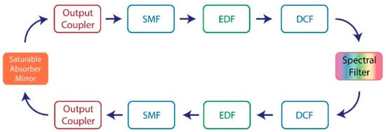 A common method developed to initially obtain high-energy ultrashort pulses from Er-doped fiber lasers relies on the principle of a chirped pulse oscillator (CPO), which takes advantage of the concept of a dissipative soliton laser [22,23,24]. In this configuration, stable mode-locked operation can be achieved using strong mode-locking mechanisms, which could include either components with high-nonlinearity such as semiconductor saturable absorber mirrors (SESAMs) [25] or nonlinear polarization evolution (NPE). The pulses are then highly chirped due to the high-normal group dispersion delay (GDD) nature of such oscillators and could be linearly de-chirped to produce ultrashort pulses with high peak powers.