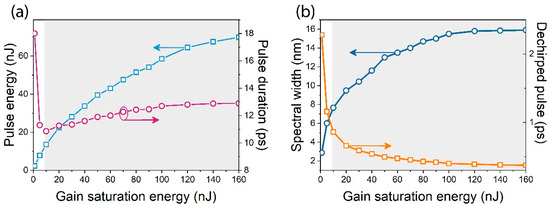 We first look at the manner in which characteristic parameters of the output pulses under mode-locking operations would evolve with the increase of pump level. The results are shown in Figure 3, where the pump power is represented by the gain saturation energy of the doped fiber. Pump powers beyond the limit shown in the figures are also emulated, and the results are not included because only undesired multi-pulse operations are retrievable.