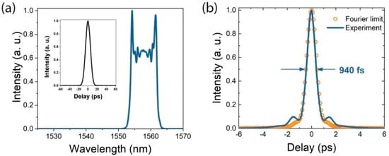 We then increased the DCF length to 15 m, consequently increasing the cavity GDD to +1.83 ps2, its length to ≈20 m, and reducing the repetition rate to 5.33 MHz for the single pulse mode-locked operations. Stable mode-locking regimes were achievable with the same tuning methods as in the previous stage and Figure 5 shows the typical output pulse characteristics of such regimes. An average optical power of 204 mW was measured from the laser output, corresponding to 38 nJ of pulse energy. The pulse duration was 14.5 ps, and could be compressed to 1 ps with the same de-chirping mechanism. The de-chirped pulse’s AC is shown in Figure 5b, together with the Fourier limit calculated from the measured spectrum (shown in Figure 5a), from which it can be concluded that the pulse was de-chirped to 1.2 times its Fourier limit at best. This configuration brought a higher pulse energy and a shorter pulse duration, but with decreased pulse quality, as the pulse could not be de-chirped completely. This was attributed to excessive nonlinear phase in the pulse indicating that the linear stretching effect of dispersion was not enough to compensate for the nonlinearity introduced by high peak powers. The results of configurations with longer DCF lengths in the cavity confirming this method could not be extended to achieve a much better energy scaling.