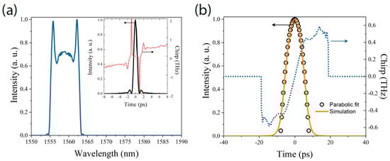 Simulated pulse characteristics from a cavity with a 10-m DCF and spectral filtering of 4.5 nm. (a) Spectral of the output pulse (inset: de-chirped pulse). (b) Corresponding temporal profile.