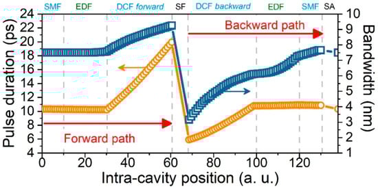 Pulse duration and bandwidth evolutions along the cavity elements.