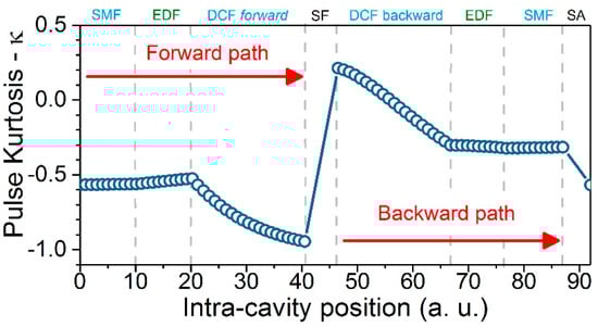 The pulse shown in Figure 6b was fitted assuming a parabolic shape as the common Gaussian shape was not matching. This made it worth investigating the pulse shape evolution inside the cavity. We could represent such an evolution in terms of pulse kurtosis (denoted by “κ”). The kurtosis is defined as , where μ4 is the fourth centered moment and is the square of the variance. For instance, κ = −0.86 corresponds to a parabolic pulse shape and κ = 0 to a Gaussian shape. This metric has thereby been used to analyze laser pulse temporal shapes [30,32]. Figure 8 shows the evolution of κ and highlights the fact that the pulse shape evolves from a Gaussian to a parabola when propagating along the cavity. The parabolic shape was reached at the end of the DCF in the forward direction, just before the spectral filter. It was also clear that the pulse shape did not evolve significantly in the EDF and SMF, which exhibited anomalous dispersion.