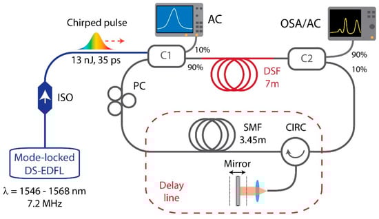 The development of high-energy ultrafast fiber lasers has attracted much interest owing to their inherent advantages including compactness, high stability, high-power capability, and turnkey operation. Motivated by demands from several key industrial and scientific applications, such as material processing, nonlinear microscopy, and high-field physics, impressive progress has been achieved in the past few decades due to both the development of novel fiber technologies and the discovery and control of novel mode-locking regimes, especially the exploitation of dissipative soliton regimes, in which significant energy scaling is achieved [1,2,3,4]. Erbium-doped fiber lasers are now a widespread technology in many applications such as free-space telecommunications, range finding, remote sensing, and medical procedures. Another category of applications of interest concerns the generation of ultrashort pulses outside the wavelength window covered by rare-earth-based fiber lasers, in particular for applications in biophotonics [5,6] and sensing [7], where low-noise pulses are required. In this frame, efficient fiber laser systems based on frequency conversion processes, e.g., four-wave mixing (FWM), have been developed, enabling wavelength tunability over several hundreds of nanometers [8]. To date, the best performances in terms of noise are obtained with synchronously pumped fiber optical parametric oscillators (FOPOs). Their combination with spectral or dispersion-based filters allowed broad tunability and high energies in the 0.7–1.3 µm wavelength range [5,6,9]. The extension of this technology in the range around 1.7 µm, which is attractive due to the enhanced penetration depth in nonlinear bio-imaging [10], and is now a challenge attracting strong attention from the scientific community [11,12,13,14,15,16,17]. Different fiber-based solutions have then been proposed, from systems relying on soliton self-frequency shift [10,18,19] to a FOPO driven by a master-oscillator-power-amplifier (MOPA) [12,20,21], to name a few. The noise characteristics of these systems and/or the use of bulky and fragile components, such as rod-type fibers, are however limiting factors for real-world applications in nonlinear imaging or ultrafast instrumentation. There is thus an identified need not only for FOPO systems emitting around 1.7 µm but also for efficient and versatile fiberized pump sources featuring at the same time relatively high energies, good noise characteristics, and the possibility to directly generate highly-chirped pulses as, in this case, dispersive tuning within the FOPO cavity can offer a supplementary degree of freedom for the FOPO’s tunability.