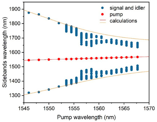 Experimental (blue dots) and calculated (solid lines) parametric sidebands as a function of pump wavelength (red dots).