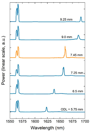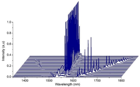 A typical FOPO output spectrum for a pump wavelength of 1566 nm is then shown in Figure 11. In this particular and optimal situation, the pump was synchronized with the idler wave and the position of the delay line allowed us to obtain signal and idler waves at wavelengths of 1475 nm and 1668 nm, respectively. The idler pulse duration, measured with an autocorrelator (Femtochrome FR-103XL), was found to be 2.5 times shorter than the pump pulse around 14 ps and its peak power was as high as 140 W. The peak emission at 1530 nm represents the amplified spontaneous emission (ASE) in erbium, and the emission around 1600 nm represents the wave resulting from the interaction by FWM of the pump with the ASE at 1530 nm.