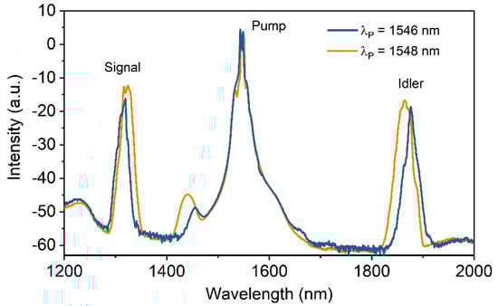 When the pump pulse at 1566 nm and the idler pulse were overlapped, the adjustment of the optical delay line in a range of 7 mm allowed for a fine tuning of the idler wave between 1620 nm and 1690 nm, as can be seen from Figure 12. For this pumping wavelength, the nanojoule level was reached in a 30 nm-bandwidth with wavelengths between 1655 nm and 1685 nm. In addition, we show in Figure 13 the FOPO tuning as a function of both the pump wavelength and ODL adjustment. With these combined techniques, the idler wavelength could be tuned between 1619 nm and 1790 nm (Figure 13) when pump pulses and idler pulses were synchronized. This limitation was caused by the rapid walk-off between pump and idler pulses. Another important process that participates in the enhancement of the idler energy around this window close to 1660 nm was the overlapping of the Raman and FWM gain bandwidths. This Raman assistance to the parametric process can be seen as an energy transfer from the up-shifted parametric component (i.e., signal) to the down-shifted component (i.e., idler) [33]. Furthest idler wavelengths beyond 1800 nm could be obtained with the synchronization of the pump and signal pulses inside the FOPO cavity while pumping the DSF in its normal dispersion. We thus show the FOPO spectra for the two pump wavelengths 1546 nm and 1548 nm in Figure 14. The conversion efficiencies were relatively low compared to those in the band around 1700 nm. When the pump was set at 1548 nm, the signal and idler were generated at wavelengths of 1322 nm and 1864 nm with conversion efficiencies of 5.93% and 2.46%, corresponding to energies of 0.23 nJ and 0.1 nJ, respectively. The extreme experimental signal and idler sidebands were centered at wavelengths of 1319 nm and 1876 nm with lower conversion efficiencies of 1.15% and 0.6%, respectively, for a pump wavelength of 1546 nm (Figure 14).