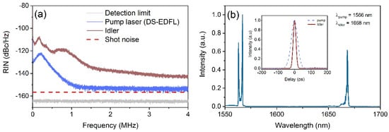 (a) Measured RIN of both pump and idler pulses. These measurements correspond to a 1.4 mA optical current. (b) Pump and idler spectra at 1566 nm and 1668 nm, respectively. The inset represents the pump and idler autocorrelation traces.