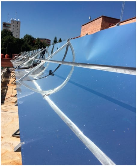The parabolic trough collector (PTC) is able to track the sun and concentrate the solar radiation into a focal line. Each device is supported by a rigid structure, over which the aluminum parabolic profiles were assembled. The reflector is an aluminum plate, the parabolic shape is obtained because the plate rest over the profiles. The absorber is a black copper tube. The rays of the sun are reflected at the focal point where the absorber is located. A fraction of the solar radiation is transferred to a fluid, which flows inside the absorber pipe [15]. The PTC design was based on the works published by Jaramillo et al. [39] and Ibarra-Bahena et al. [40]. The material and manufacture process considered the Jaramillo’s design and were installed at the CIICAp. Figure 1 shows the PTC field. The collectors’ array consists of 15 parabolic trough collectors of 38.43 m2 area and divided into three rows. The tracking system was one-axis North-South direction.