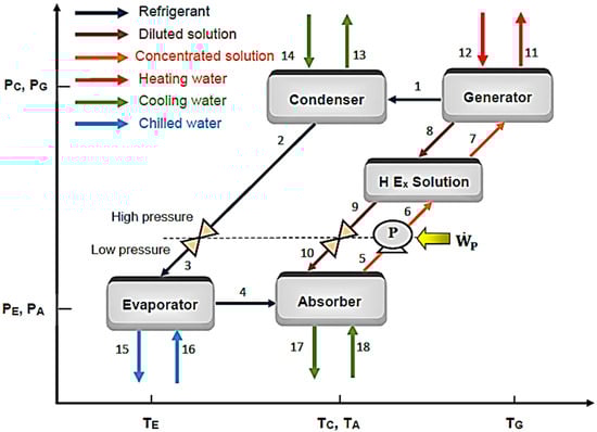 - Patel, J.; Pandya, B.; Mudgal, A. Exergy Based Analysis of LiCl-H2O Absorption Cooling System. Energy Procedia 2017, 109, 261–269. [Google Scholar] [CrossRef]