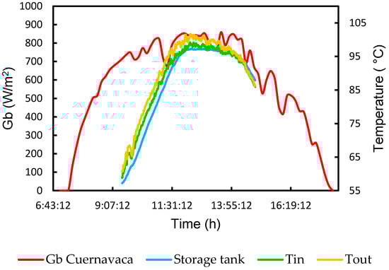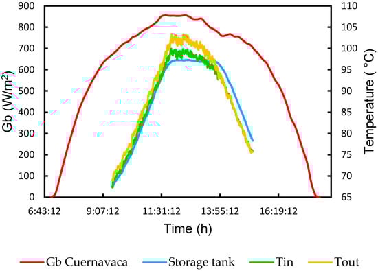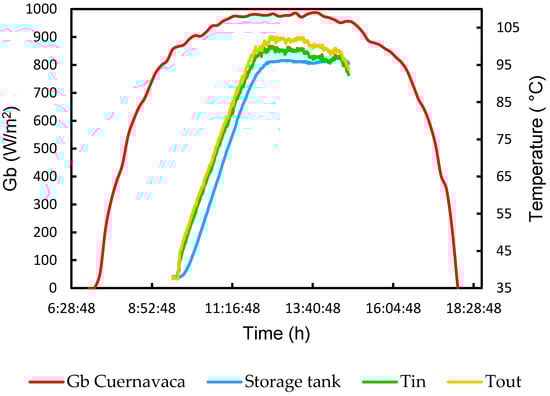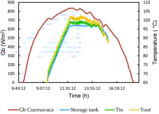 The test of corresponding of 29 November is presented in Figure 6. It shows the profiles of inlet, outlet, and storage tank temperatures during the day in Cuernavaca city. The solar radiation showed a Gaussian profile, the maximum Gb was 835 W/m2, after the 12:10 p.m. a few clouds showed up. The temperature profiles for the variables Tin and Tout, diminished when the clouds appeared. The evaluation was realized for 6 h (9:30 a.m.–15:30 p.m.). In this plot is possible to identify three sections also, the stable section was in a range from 11:39 a.m. to 14:39 p.m. During this section, the average storage tank temperature was 96.93 °C and the maximum outlet temperature of HTF was 102.72 °C.