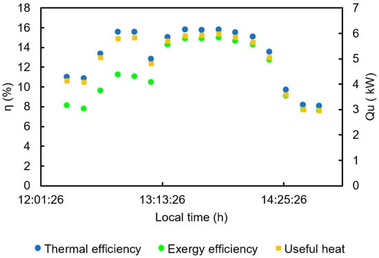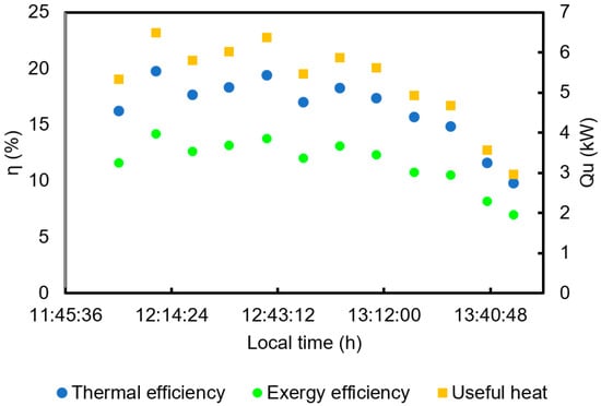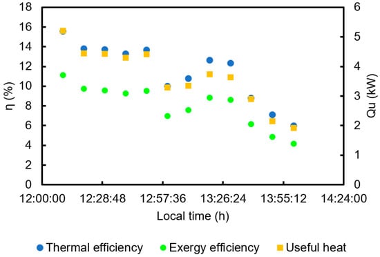 The analysis of thermal efficiency and useful heat is presented in Figure 7. It shows the behavior of thermal efficiency for the stable section, for which the maximum value calculated was 16.95%, this value is the average efficiency for a 10 min period. The useful heat behavior varied from 2.9 kW to 5.2 kW, the Gb was registered between 700.1 W/m2 to 832 W/m2. In this case, the exergy efficiency varied between 7.4 and 11.7.