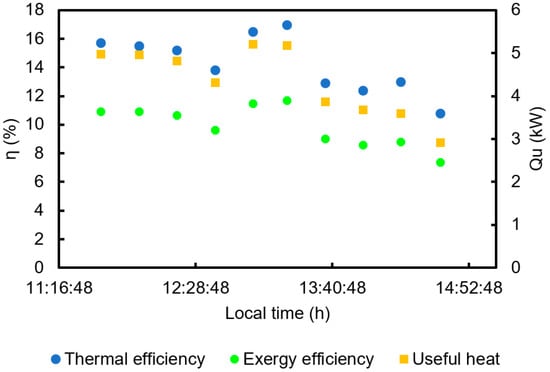 The analysis of thermal efficiency and useful heat are presented in Figure 11. It shows the behavior of thermal efficiency for the stable section (9:30 a.m.–15:00 p.m.), for which the maximum value calculated was 15.80% and the minimum was 8.05%. The useful heat behavior varied in a range from 2.95 kW to 5.98 kW, the Gb was registered between 981 W/m2 and 954 W/m2. The decreasing trend in the useful energy is associated with the proximity of this temperature to the boiling temperature in the city of Cuernavaca. The exergy efficiency follows the same trend than others parameters, varying from 7.8 to 15%.