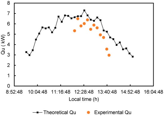 In Figure 12, a comparison of the theoretical and experimental useful heat for the collectors’ field is presented for one typical day. The figure shows a variation of Qu as a function of the test time. The theoretical maximum values were obtained at solar noon, when the value of the angle of incidence is zero. In Figure 12, the useful heat flux is affected by the global thermal losses estimated as (UL’) × (Ar) = 13.67 W/K. However, the negative trend for larger values of the angle of incidence is caused by the incidence angle modifier described by the Equation (3).