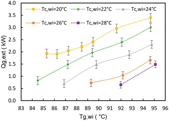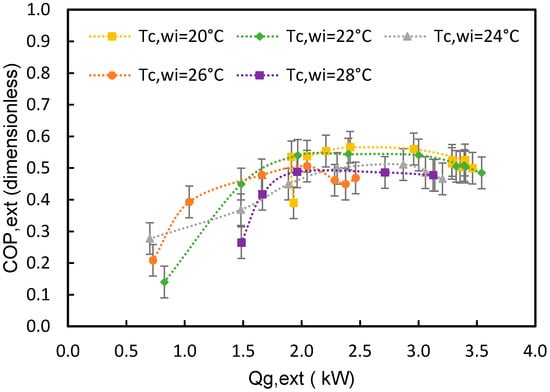 Figure 15 shows the variation of the external coefficient of performance as a function of the external heating power, for each condensation temperature. From this figure it is observed that for each curve, as the heating power increases, the COP initially presents an increasing trend, after that, it reaches a maximum point and subsequently decreases with the increase in the heating power. It is worth mentioning that since during the tests reported, the solution mass flow rate was maintained constant through the system generator, so the increase in thermal power is due to an increase in the generation water temperature.