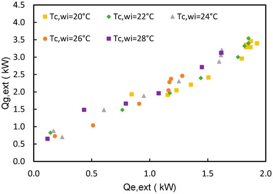 In Figure 14, the external generation power is plotted as a function of the external cooling power. In this figure, it can be seen that for each condensation temperature shown, there is an approximately linear relationship between these variables. This figure shows that, for the range of operating conditions shown (condensation water temperature), a linear function can be found that relates the required generation power to the desired cooling power.