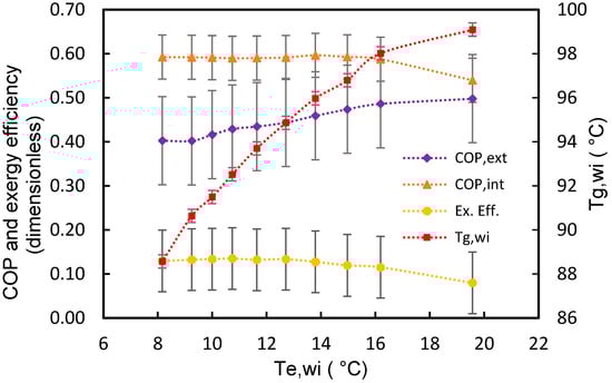 Finally, Figure 16, shows the variation in internal and external coefficients of performance as well as the exergy efficiency for the absorption cooling system, as a consequence of the simultaneous variation in the temperatures of the heating water and the water to be chilled in the evaporator. It is observed that during the experimental test, the internal coefficient of performance showed a slightly increasing trend, which is due to the effect of increasing the temperature of the heating water. On the other hand, the curve corresponding to the external COP shows a downward trend, which indicates that this parameter is more sensitive to the changes in the temperature of the water to be chilled than to the changes in the heating water temperature. The exergy efficiency was calculated using exclusively external parameters. Figure 16 demonstrates that the highest exergy efficiency is obtained when the heating water temperature is minimum, in spite of the temperature of the water to be chilled, this fact would suggest that the higher generation temperatures the higher exergy destruction is obtained.
