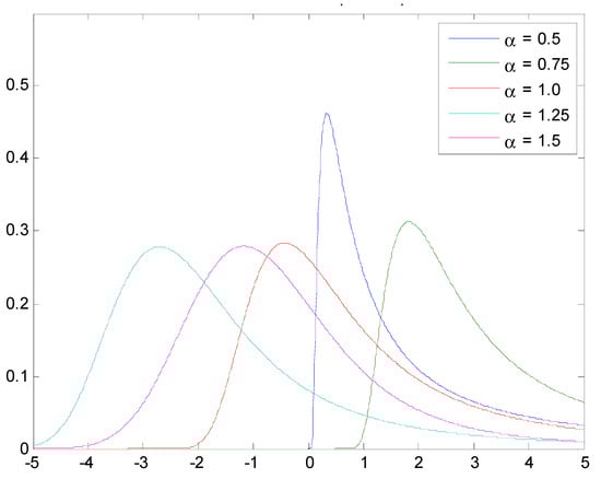 Asymmetrical steady state distribution Sα(1,0.5,0) with different α values.