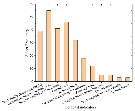 In order to reasonably determine evaluation indexes for the stability of roadway surrounding rock, we referred to nearly 80 academic papers involving the classification, evaluation, and prediction of roadway surrounding rock stability from the Chinese Journal of Rock Mechanic and Engineering, Rock and Soil Mechanics, Chinese Journal of Geotechnical Engineering, etc. (Table 1). The results are plotted in Figure 4. According to principles such as independence and data availability in index selection, we employed five indexes whose chosen frequency was greater than 20 as evaluation indexes for the stability of roadway surrounding rock.