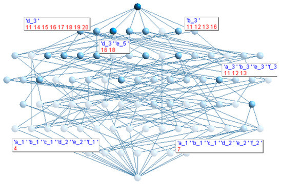 Based on the basic theory of a concept lattice described in Section 2.1 and concept lattice graphs, each node in Figure 5 then represents one concept, and different colors show the different number of objects contained within the node. The greater the number of objects, the darker the color. The label on the node, which is the concept of the node, shows information on the attributes and objects, and the lines among various nodes represent the generalization and specialization relationship between different nodes. Meanwhile, the relationship between the upper concept and the lower concept on either end of the line equates to the relationship between the parent concept and the child concept, and the concept on top is the largest parent concept.
