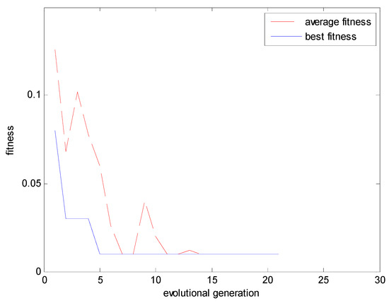 According to the method described in Section 3.2, we used the genetic algorithm to compute parameter α, γ and set W as 0.01, then obtained the fitness curves shown as Figure 6. For the smallest fitness, we obtained the optimal solution with values of α and γ of 0.2848 and 1.5963, respectively.