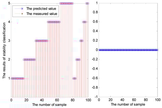 By inputting the 1st to 100th group of model training sample data back into the stability prediction model for roadway surrounding rock using the improved probabilistic neural network, the resulting prediction accuracy rate was 100%, indicating that the prediction model is stable and reasonable. Figure 7 shows the training effect of SαS − PNN and the error graph.