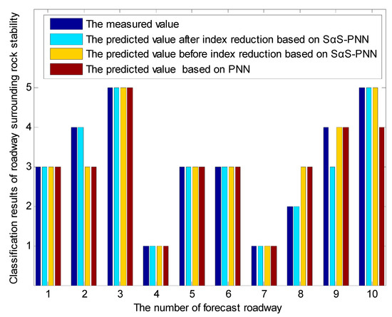 By incorporating the statistics of the indiscriminate samples in Table 5 into the concept lattice of roadway surrounding rocks stability and the prediction model of the improved probabilistic neural network, this paper reports the prediction result of laneway surrounding rock stability shown in Figure 8 and the prediction accuracy rate for all prediction models shown in Table 7. The results show that the accuracy rate of prediction is 90%, which is coincident with the actual engineering situation. The accuracy rate of prediction result before index reduction is 80%, and that of non-improved probabilistic neural network prediction model is 70%, and that of mean value method is 50%.