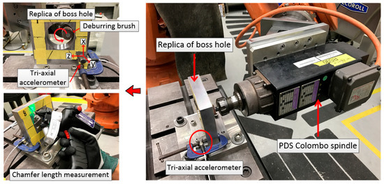 To answer the aforementioned challenge, an experimental setup to represent the actual process on the shop floor is established. The experimental setup requires the preparation of a work coupon, ABB robotic programming, and a vibration data acquisition system, including the use of an accelerometer and LabVIEW (2015, National Instruments, Austin, TX, USA). The work coupon was designed to replicate the combustor casing boss hole, as presented in Figure 4. It was designed to represent the actual Trent 700 combustor casing boss hole during the lab-scale deburring process. A detailed specification of the work coupon can be found in Reference [11]. The deburring experimental setup is shown in Figure 5 and Figure 6. It comprises an ABB IRB 6660 robot with an electric power spindle (PDS Colombo RS 90). A standard mounted flap wheel (aluminium oxide) with a grit size of P80 is used as the deburring brush for removing the burrs and sharp edges of the boss-hole replica. The rotational speed of the spindle is controlled by a variable frequency drive set to 166.67 Hz, which corresponds to 10,000 RPM and a feed rate of 30 mm/s.