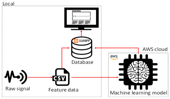 In our approach, most of the components of our system will run locally except for the real-time prediction of the machine learning model which will run on the AWS cloud. The local components include the sensor signals, the feature data, the database, and the data visualization chart. Figure 7 shows a pictorial representation of our monitoring system.