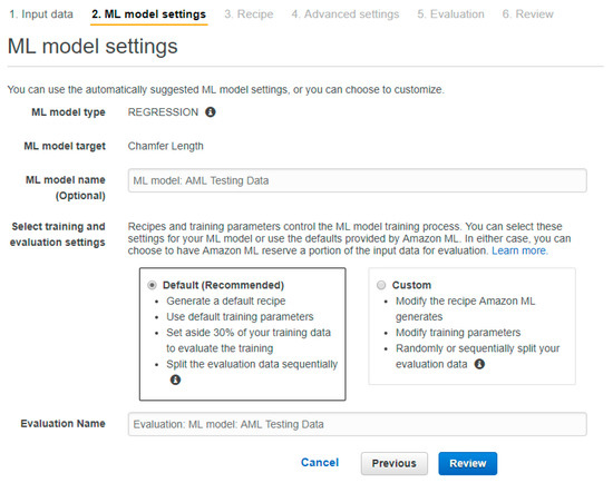 Since our aims are to predict the chamfer length based on the features extracted from the three axes of the (X, Y, and Z) vibration signal, a multivariate linear regression is used. It is worth noting that the inputs and output must have a linear relationship for the model to perform effectively. This requirement has been tested for the features and the chamfer length. The full data used for creating the machine learning model are presented in Table 2 and Table 3. We used 50% of the dataset to train the model and the other 50% to test and evaluate the model. By utilising the framework provided by AML, a regression model was created and evaluated. Two CSV files, one containing the training data and one containing the testing data, were first uploaded onto Amazon S3, which is a cloud-based database developed by AWS. The motivation for using this database was due to the ease through which the data could be access by AML. Following this, we used the AML interface to create an input data source pointing to the training CSV file. The interface automatically assigns a datatype based on the values in the CSV file. The datatype will be assigned as binary, categorical, numeric, or text. Users can change the datatype accordingly if the assigned datatype was incorrect. For our dataset, we assign the numeric datatype to the chamfer length and to the corresponding X-axis, Y-axis, and Z-axis power spectrum density magnitude values. The pass is assigned as a categorical datatype.