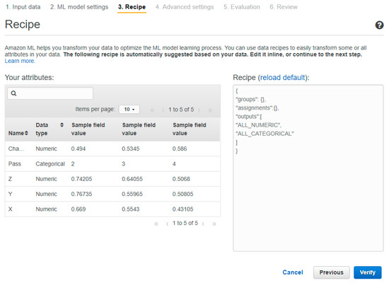 All the data in our data source will be used to train the machine learning model. Thus, we do not need to apply any groupings or data transformation. Hence, we applied a custom recipe to train our machine learning model based on these specifications, as shown in Figure 10.