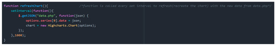 To create the data visualisation chart, a javascript library known as Highcharts was utilized. Highcharts was chosen for to several reasons. Firstly, it is a generic library that allows for the simple integration with major web frameworks. Additionally, it is based on a scalable vector graphics technology and works with HTML5, which is the current trend in data visualization [12]. The HighCharts library is able to create dynamic charts which allow users to interact with the data. It is also an extremely flexible library with a wide range of charts to choose from. This is important in order to create impactful charts that are able to convey the trends and focal points clearly. Since the aim is to create a real-time system, the chart needs to be able to refresh itself whenever new data is obtained. To achieve this, the refreshchart function is called upon from the HighCharts library and the chart is set to refresh every 5 s. This timing was obtained by taking into account the average time required for each pass in the chamfer deburring process. The chart refresh function in HTML is presented in Figure 12.