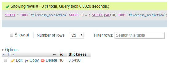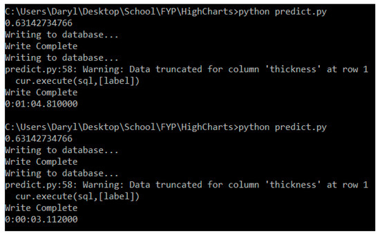 When conducting the system testing, the python application displayed the prediction result and imported the sensor data and predicted data into the local database, as shown in Figure 15. Additionally, we confirmed that the prediction result was successfully written into the database by querying the latest input, as shown in Figure 16.