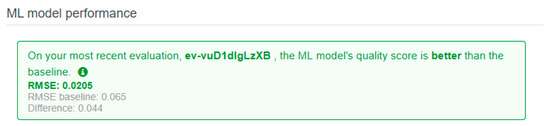 To start the evaluation process on AML, we require a machine learning model that will be created after the training process. A data source with a scheme similar to that of the training data source must be created before it proceeds to the evaluation. The actual values of the target variable must also be included in the evaluation data source, as AML will compare the actual values with the predicted ones. The general process flow for developing a machine learning model on AML is illustrated in Figure 8.