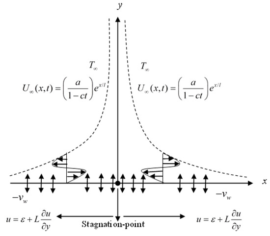 The system of two-dimensional laminar incompressible unsteady stagnation-point flow (density is constant), permeable surface, stretching/shrinking sheet in the water as the base fluid with different types of nanoparticles, i.e., Copper, Alumina, and Titania, is studied, as the Tiwari and Das model is considered. Let the unsteady free stream velocity be , is the stagnation length, and is the flow unsteadiness parameter. Assume that the plate velocity is where for stretching velocity rate, for shrinking velocity rate, is the characteristic length, and represents mass flux velocity with as a constant. Let the slip occur between the fluid and the surface, which is represented as , where is the slip length (see Bhattacharyya et al. [8]). The reference temperature, ambient temperature, and temperature distribution near the surface are , and , where both and are constants. Apart from that, the x-axis is parallel to stream direction while the y-axis is perpendicular to it. A schematic diagram of the problem is shown in Figure 1.