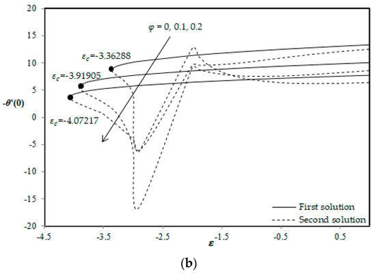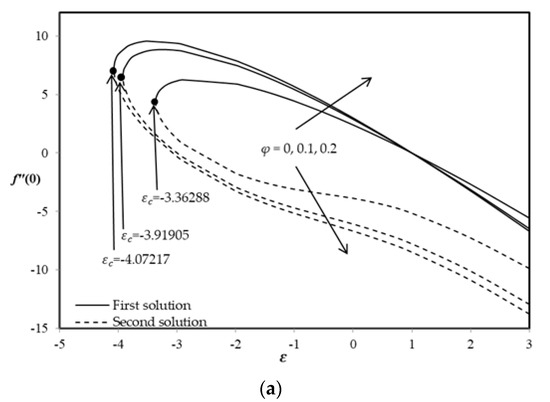 The effects of the nanoparticle volume fraction on the skin friction coefficient and heat transfer coefficient with stretching/shrinking parameter in Copper-water nanofluid are depicted in Figure 2. Both figures show that dual solutions can be obtained when , while no solution can be found when , i.e., where the critical point represents the end point of the existed solution. The range of solutions was shown to widen when the amount of Copper nanoparticles in the water increases. Apart from that, the skin friction coefficient for both solutions in the shrinking surface was found to be higher than in the stretching surface, while the heat transfer coefficient shows the opposite trend. Moreover, increasing the volume fraction of Copper nanoparticles in water increases the skin friction coefficient for the first solution, but decreases the second solution. Meanwhile, for the heat transfer coefficient, increasing shows a decreasing trend for both solutions.