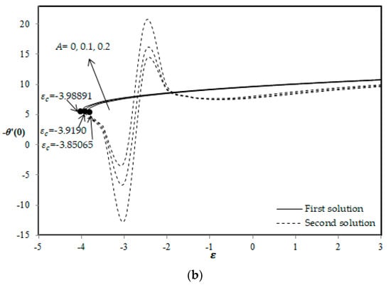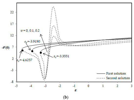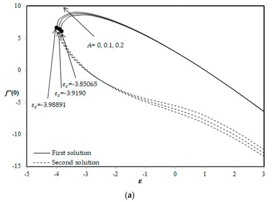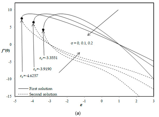 The dual solutions of the ordinary Equations (11) and (12), along with the boundary conditions (13), are found using the bvp4c program in the Matlab software (Software, MathWorks, MA, USA). The program is a finite-different code which applies the three-stage Labatto IIIa formula and its algorithm, depending on an iteration structure, in solving the system of equations. The collocation of formulas and polynomials gives a C1-continuous solution with fourth-order accuracy. In this program, the missing values of the skin friction coefficient and heat transfer coefficient are found by setting some values of initial guesses for the different tested parameters, and asymptotically fulfilled the far-field boundary conditions. The finding process is repeated until no more solutions can be found either beyond a point, namely, the critical point , or for a certain domain if the critical point is hard to find, or the point does not actually exist. Some points near the critical values for the first and second solutions are then tested using the stability analysis to find the smallest eigenvalues, , to determine the stability of the solutions. The smallest eigenvalues can be found by solving the linearized problem (26)–(28) using the same program for both the upper and lower solutions. Positive eigenvalue indicate that the solution is stable, while negative values shows an unstable solution.