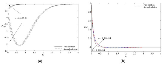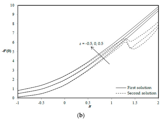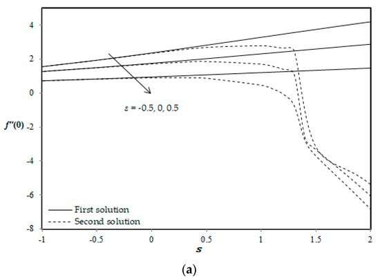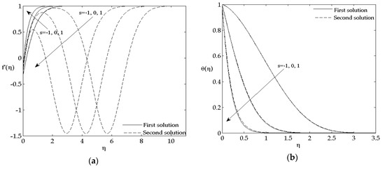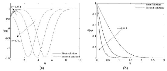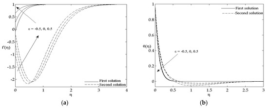 Figure 5 is presented in order to show the effect of the parameter with the suction/injection parameter on the skin friction coefficient as , and the heat transfer coefficient where the dual solutions are obtained for a permeable surface and an impermeable surface . Figure 5a shows the decreasing skin friction coefficient for the first and second solutions when the value of is increased. This indicates that the resulting skin friction coefficient for the shrinking case is higher than that of the skin friction coefficient, which is caused in the stretching case by either a permeable or an impermeable surface. Figure 5b displays the opposite trend, where the heat transfer coefficient increases as increases for both solutions. This indicates that the heat transfer rate over shrinking surface is higher than that over a stretching surface for each parameter. In addition, it is clearly seen in Figure 5 that the solution for the second solution was easier to find with a higher value of . Furthermore, as the effect of the suction parameter becomes stronger, or the effect of injection parameter becomes weaker, the skin friction coefficient increases for the first and second solutions , and the heat transfer coefficient increases for both solutions.
