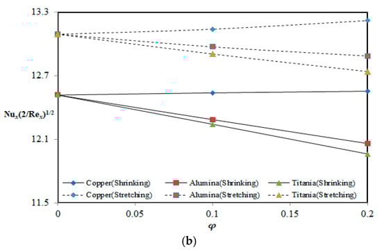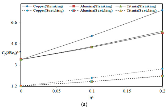 Figures of local skin friction coefficient and local Nusselt number from Equations (16) and (17) are illustrated in Figure 6 with different nanoparticle types, namely, Copper, Alumina, and Titania, for various nanoparticle volume fractions in the base fluid over both stretching and shrinking surfaces. The local skin friction for the shrinking surface is much higher than that over the stretching surface, which indicates that the shear stress between the surface and fluid is larger for the flow over a shrinking sheet than a stretching sheet. Meanwhile, the local Nusselt number for the stretching surface is obviously higher than that for the shrinking surface. This denotes that the heat transfer rate at the surface is greater when the sheet is stretched. The increasing of nanoparticle volume fraction from 0 to 0.2 in water affects both the local skin friction coefficient as well as the local Nusselt number, where it increases the local skin friction for each nanoparticle over both stretching and shrinking surfaces. However, only the Copper-water nanofluid showed an increase in transferring the heat at the surface; the two other types of studied nanoparticles, Alumina and Titania, caused a decrease in the value for the local Nusselt number. These figures also show that different types of nanoparticles have a significant affect on shear stress and the heat transfer rate at the surface. The Copper-water nanofluid was found to have the highest local skin friction coefficient and local Nusselt number for each value of the nanoparticle volume fraction over both surfaces. This means that the Copper-water nanofluid causes larger shear stress at the surface, and also has the ability to transfer heat at the surface more effectively than Titania and Alumina, since Copper has the highest thermal conductivity, as can be seen in Table 1.