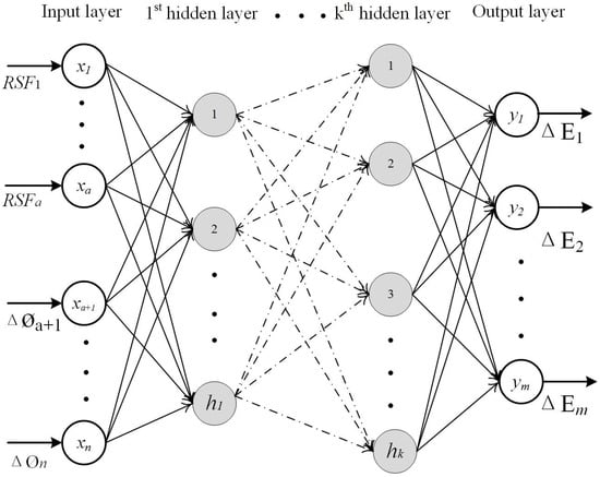 The number of input and output neurons (n, m) and the hidden layer (k) are first determined based on the engineering problem of interest. In our case, the total number of damaged elements and the total number of damage indices are known. The total number of units in the ith hidden layer (hi) is determined by the following function: