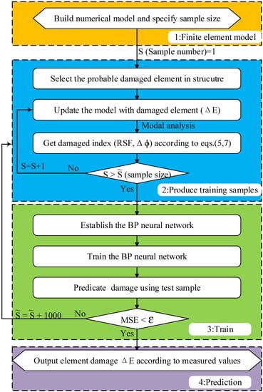 A general damage identification procedure is proposed in this paper. As shown in Figure 3, the procedure includes four main steps including finite element modeling, production of training samples, training of neuron networks, and prediction of structural damage. In the first step, detailed finite element models of offshore structures should be established for individual projects. The sample number and the prediction precision ε also need to be specified in this step. In the second step, the training samples are produced using the updated damaged model. As mentioned in Section 2.1 and Section 2.2, the difference of the elastic modulus between intact and damaged elements may be used as a damage indicator (ΔE), and the relative difference of the square frequency () and the modal difference (ΔØ) can be used as damage indices. To reduce the total number of damage indices, this paper proposes to use the combined damage index ([RSF, ΔØ]) and the damage values of elements (ΔE) as the training data for the BP networks. The training data are obtained from modal analysis of the finite element model. In the third step, neural networks are established using the training data, and then the networks are trained using the training samples. Note that the trained BP networks must be validated using a test sample. Steps 2 and 3 involve iterations. If the prediction precision is less than the given value ε, the process will switch to the second step to enlarge the training sample numbers . In the fourth step, prediction of damage is performed using the modal values from sensor measurements.
