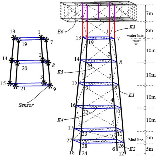 The paper selects a representative jacket platform as shown in Figure 4. The jacket structure is composed of four main tubes connected by horizontal and diagonal members. There are two platforms upon the mean water level, and their sizes are both 30 × 20 m in plane view. The vertical dimension between the waterline and the top deck is 15 m. The overall height of the structure is 65 m. Detailed dimensions are shown in Figure 4. During the finite element calculations, the ANSYS software was used. Deck beams are square steel tubes, and all the other members of the platform are circular steel tubes. The section parameters and finite element types of the structural members are listed in Table 1. During the damage identification, 12 sensors are used to measure the local structural deformation. The sensors are located at important nodal positions close to the water surface; see Figure 4.