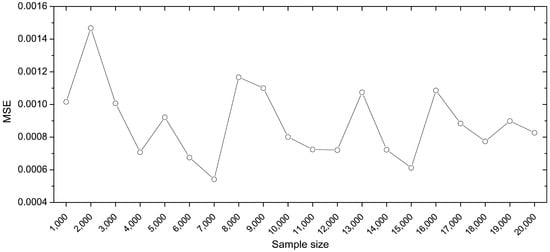 To study the influence of the training sample size on the accuracy of prediction, this paper selects random training samples from the 20,000 groups of sample data. The training sample size is increased from 1000 to 20,000 at an interval of 1000, and 20 groups of training samples are used to train the networks. In this work, four groups of test samples listed in Table 3 are generated randomly using the trained networks. The accuracy of the predicted value is analyzed using the mean squared errors (MSE) which calculates the summed errors between the predicted and original values of the test sample. If N data are divided into r groups, and the sample variance of group i is , then the formula of MSE can be written as follows: