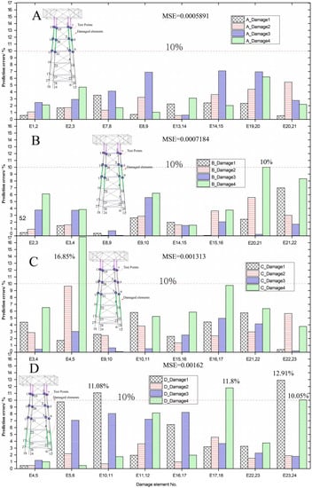 In reality, damage can occur to any structural components randomly. However, the components near the water level are relatively more vulnerable to damage because of higher exposure to corrosion and wave impact. Still, for the sake of simplicity, we divide the whole underwater structure into four areas from top to bottom: A, B, C, and D. In each area, eight elements are assumed to be damaged, and the corresponding element numbers are summarized in Table 4. Note that existing sensors are all located in area A. It is interesting to test the prediction accuracy when damaged elements are located in areas B, C, and D.